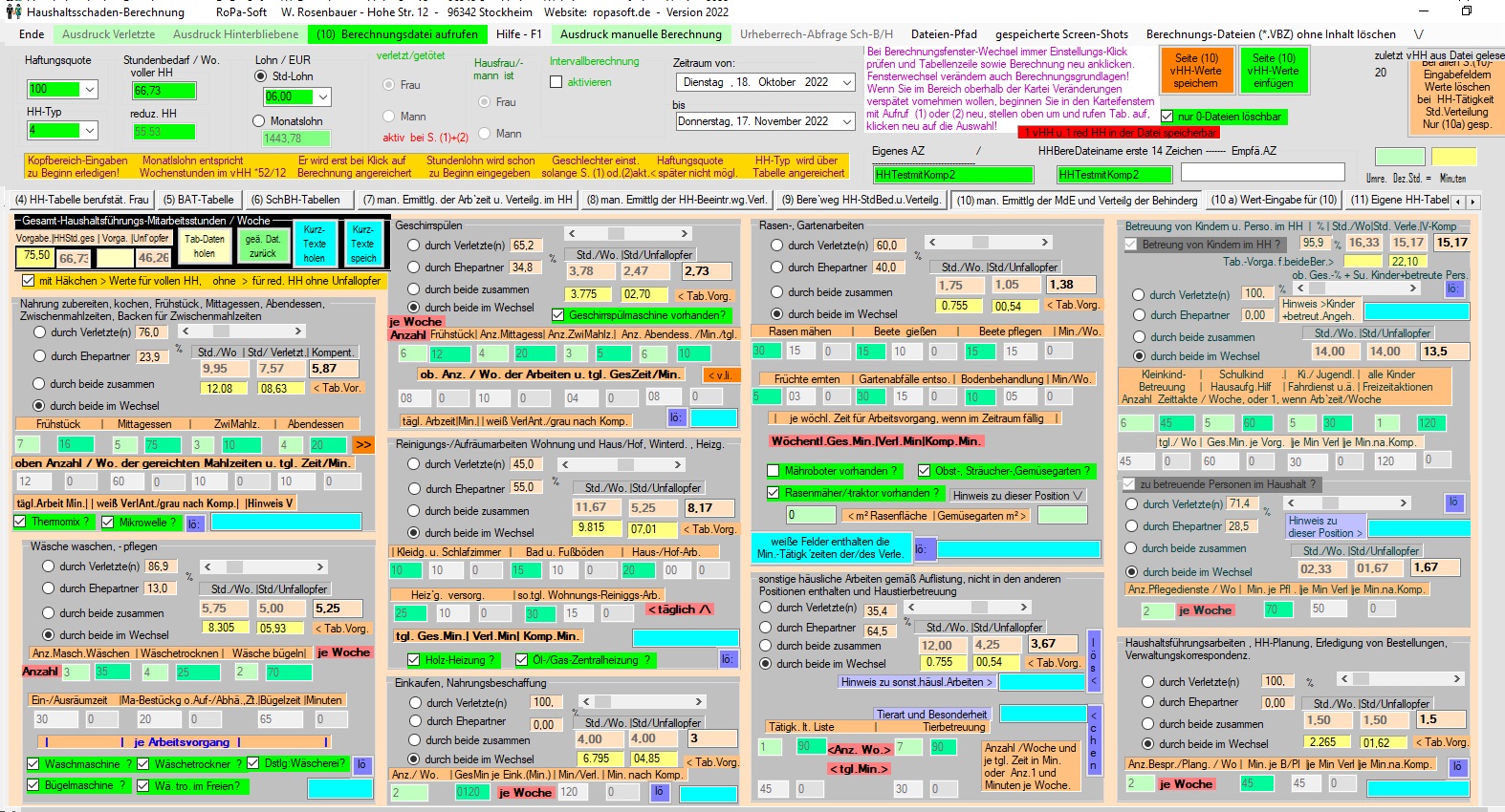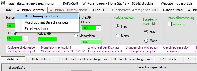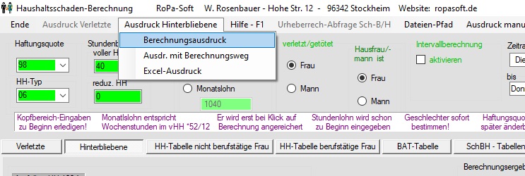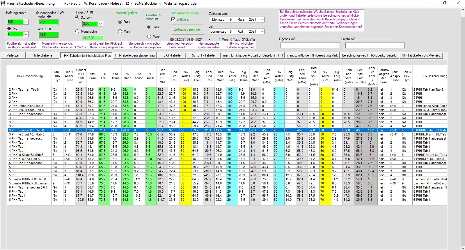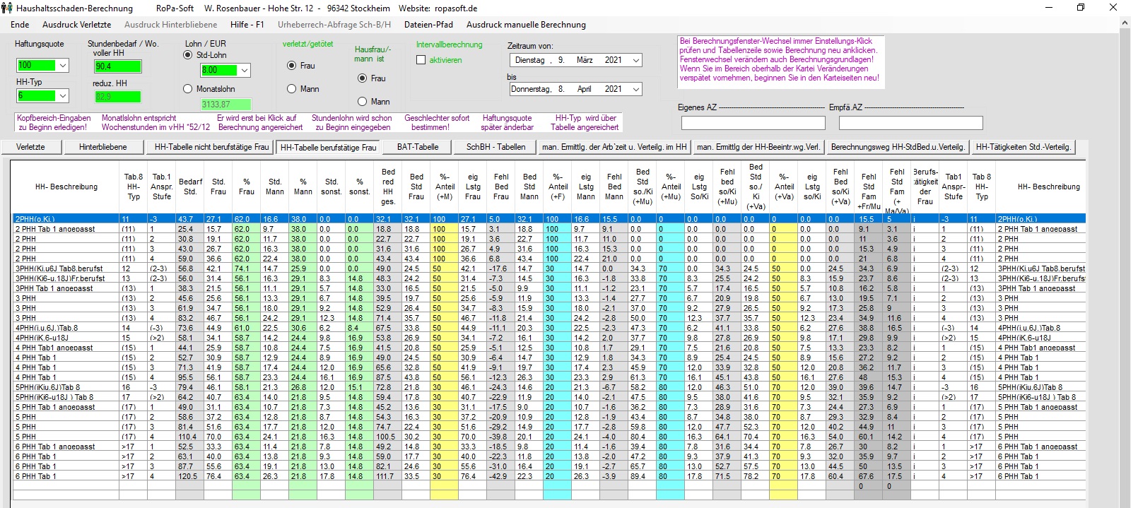 berechnet. Im Programm wird der HH-Schaden allein für den Ausfall von HH-Arbeitszeiten ermittelt.