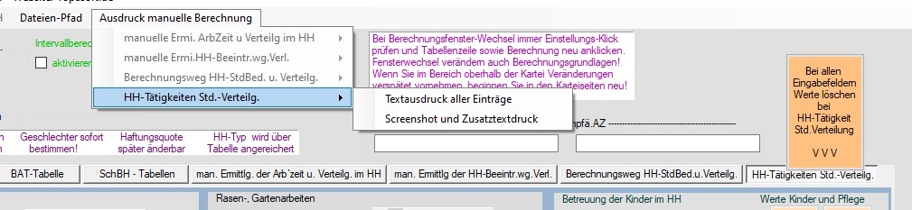 Hier wird ein SubMenue aktiviert, das zu den Eingabefeldern und Schaltflächen oder Fragen Einzelaufrufe von Hilfetexten ermöglicht.