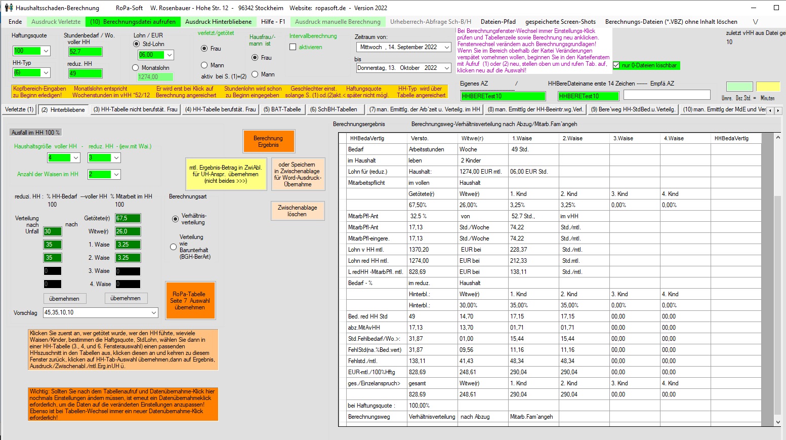 zeigt die Tabelle 3 im Untermenue. Diese Tabelle hat nach Angabe des Verf. nur für den Getötetenfall Gültigkeit. Die von RoPa-Soft erstellte