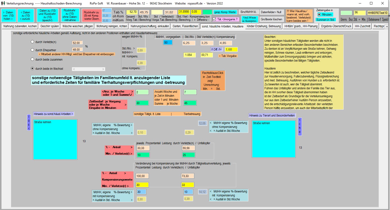 Einzugeben ist der Wochen-Stundenbedarf für die Bewältigung der Arbeiten im vollen Haushalt. Bei Verletzten haben Sie die Möglichkeit,