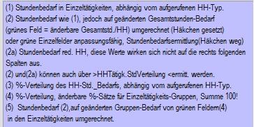 als auch mit Einzel- und Gesamt-Stunden beschrieben. Es existieren 9 Tätigkeitsgruppen, in Tabellen beschrieben.